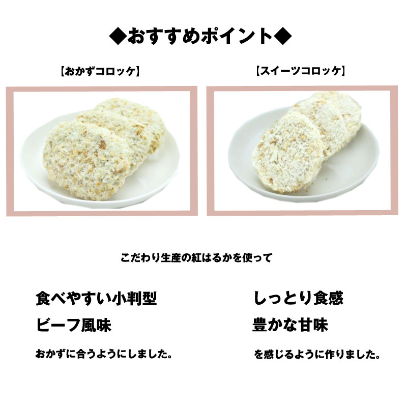 紅はるかで作ったおかずコロッケ15個と紅はるかで作ったスイーツコロッケ15個の計30個となります。
