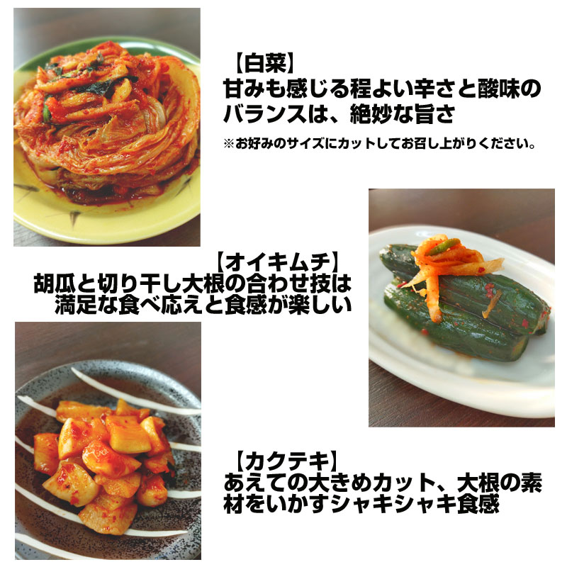 白菜(国産)、大根、にんじん、ニラ、漬け原材料:唐辛子(中国産)、にんにく(中国産)、しょうが(中国産)、食塩、砂糖、ごま、オキアミの塩辛、鰹だし、昆布だし)/調味料(アミノ酸等)、(一部にごまを含む)