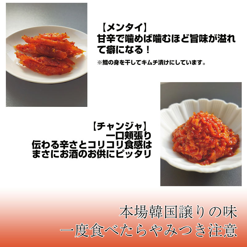 鱈胃袋(アラスカ産)、切り干し大根、にんにくの芽、へチャンドルコチュジャン、水飴、コチュジャン、三温糖、唐辛子(中国産)、ごま油、蜂蜜、醸造酢(アルコール、穀類[小麦、米、コーン]食塩、酒かす)、カナリ(いかなご)エキス、にんにく(中国産)、しょうが(中国産)、鰹だし、昆布だし、ごま/調味料(アミノ酸等)酒精、ビタミンB1、トレハロース、PH調整剤、ベニコウジ色素、増粘剤(キサンタンガム)、(一部に大豆・小麦・ごまを含む)