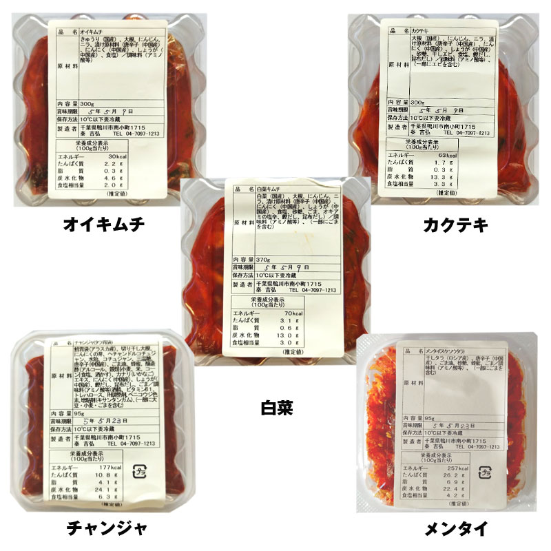 千葉県鴨川市の田園風景の中にある「つけもの秦」さん。知る人ぞ知る、隠れた名店・キムチ専門店がネットショップに初出店です。店舗で人気の5品(白菜370g・オイキムチ250g・カクテキ250g・メンタイ95g・チャンジャ95g)をセットにしました。この機会に是非ともご賞味ください。